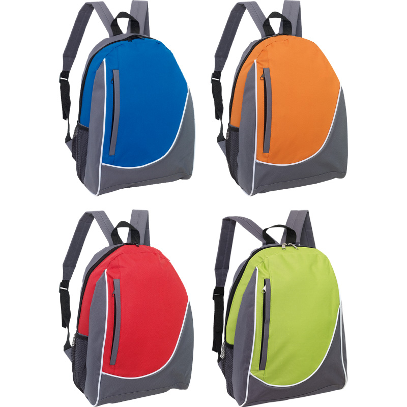 28,5 x 15 x 39,5 cm. Capacidad 14 litros. Aprox. Polyester 600D. Bolsillo frontal con cierre, vivos blancos. Un compartimento principal. Correas regulables herrajes plásticos.