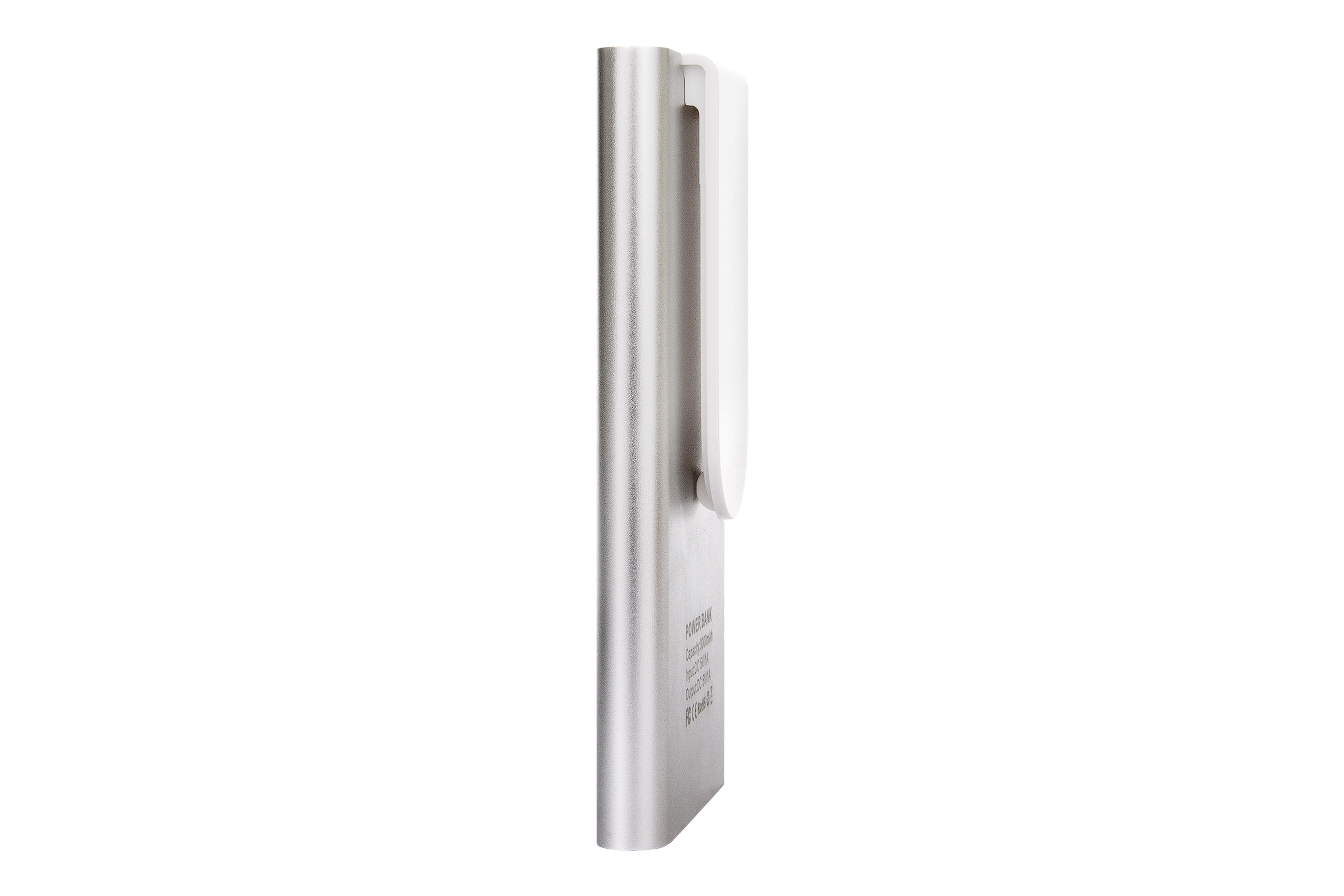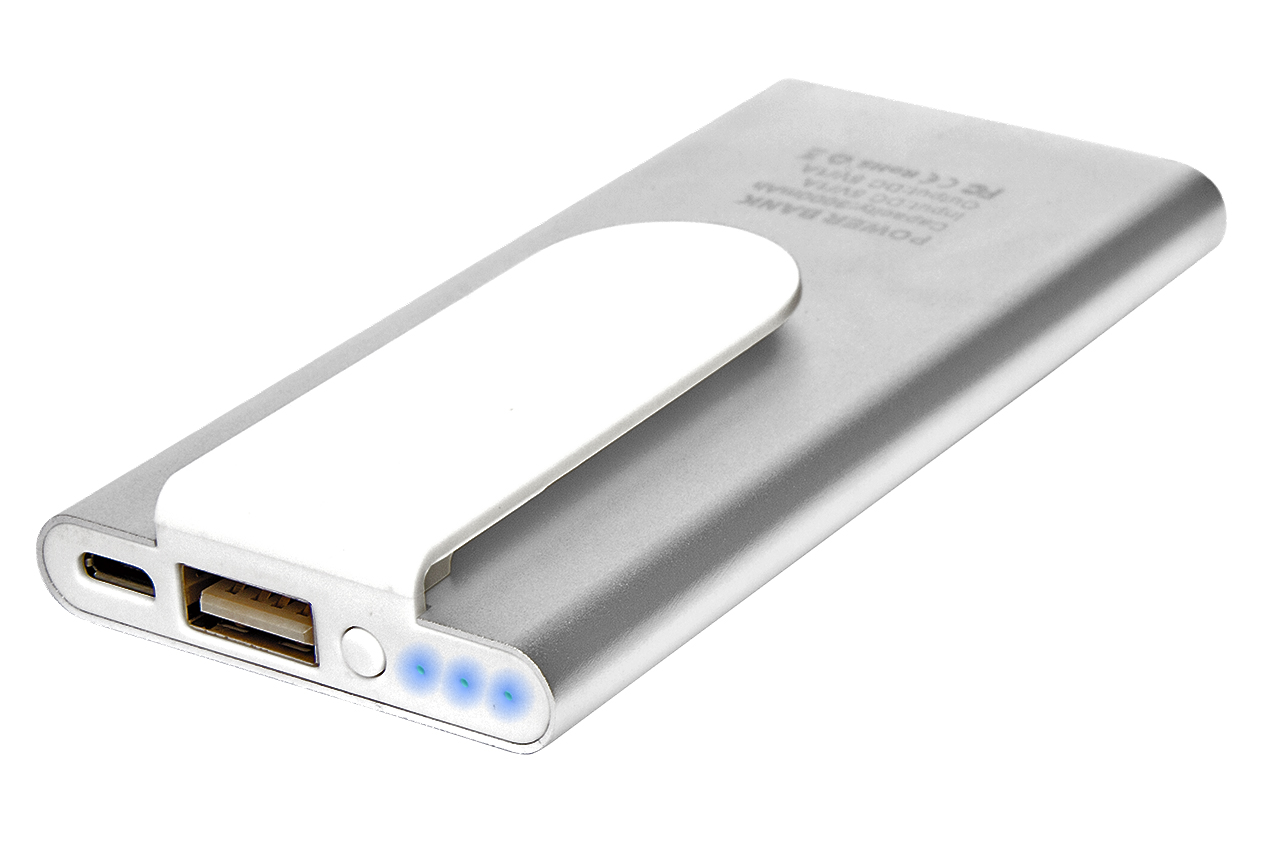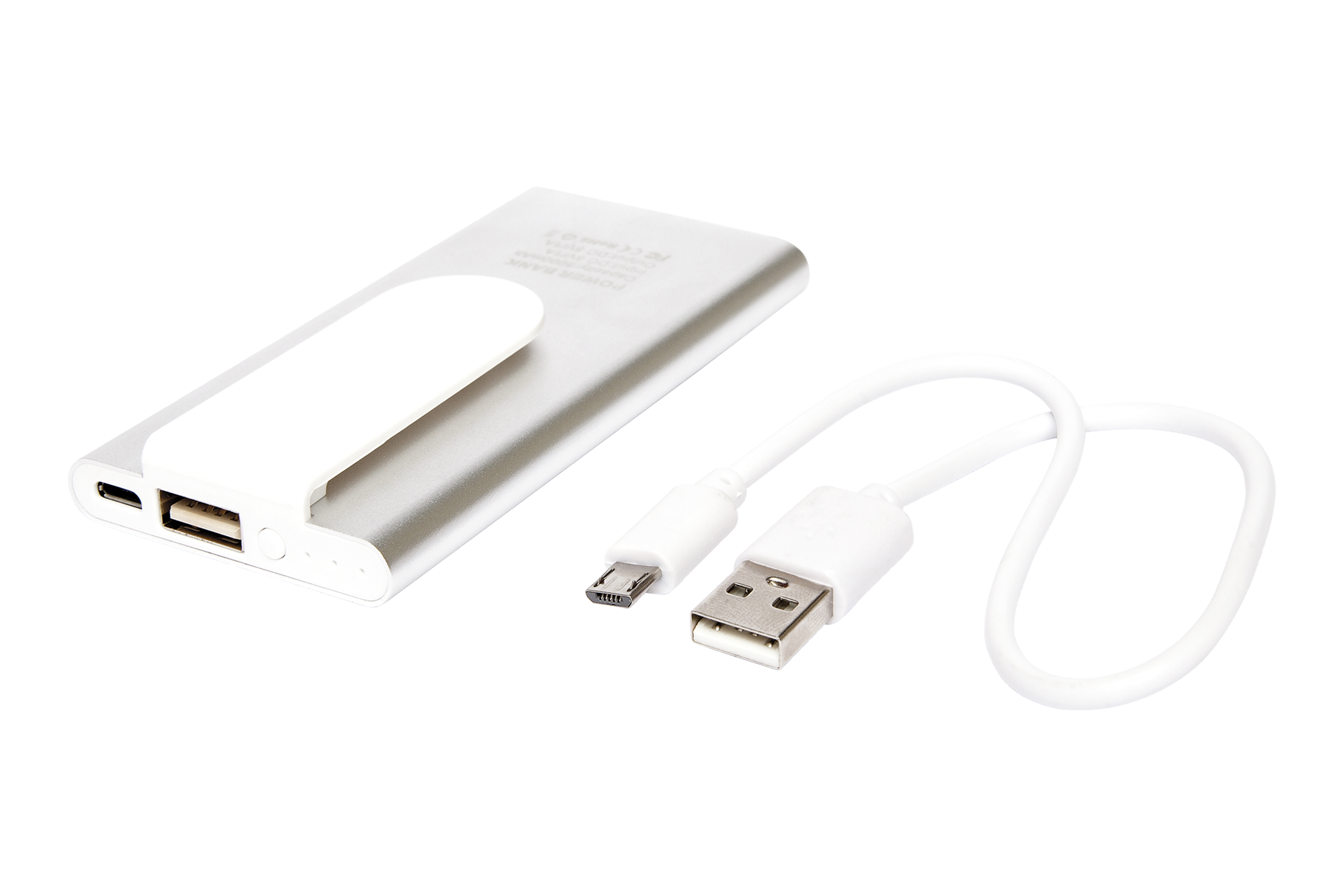 10 x 5 x 1 cm. Capacidad 3000 MAH. Metal. Cargador móvil para celular, Mp3, Mp 4 y cámaras digitales. Un puerto USB y un mini puerto USB. Luces indicadoras de nivel de carga. Con clip sujetador.