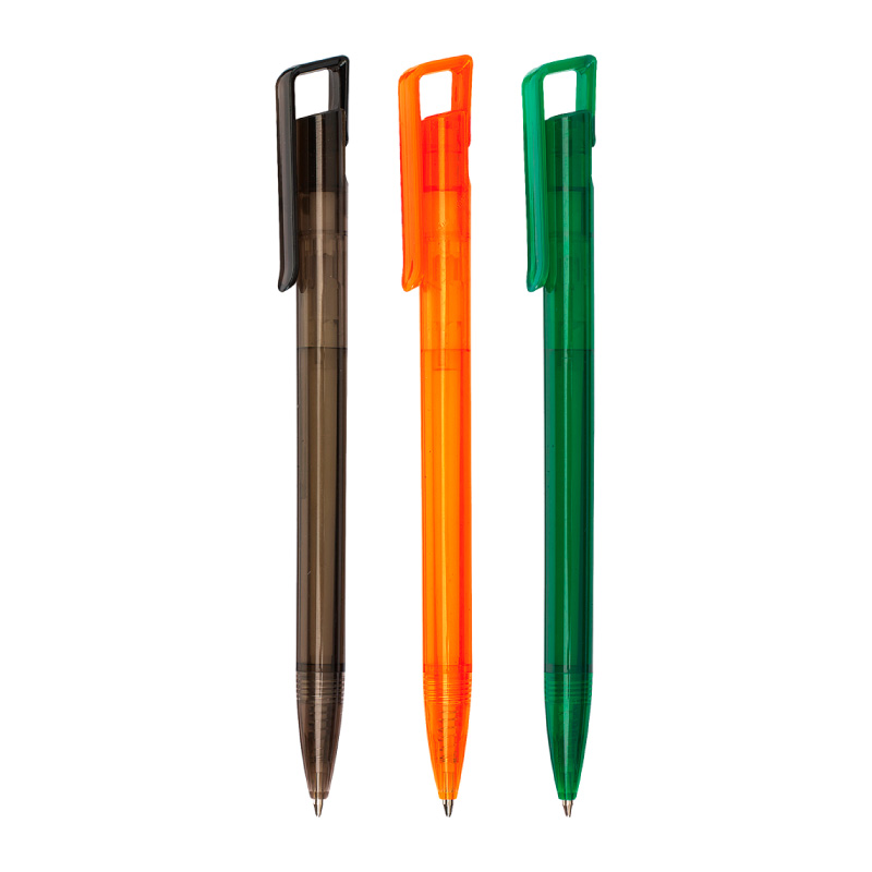Plástico. Bolígrafo con cuerpo plástico semitransparente de color con pulsador. Tinta negra.