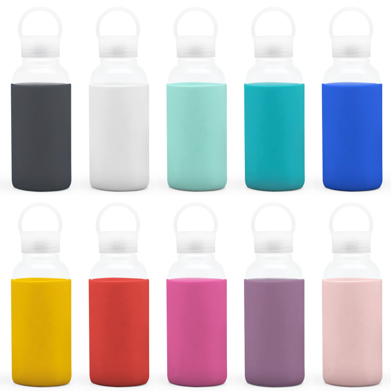 Ø 6,5 x 20 cm. Capacidad 350 ml. Vidrio de borosilicato. Botella práctica y reutilizable. Posee manga de silicona antideslizante en varios colores y pico ancho. Tapa a rosca, antiderrame y con manija de agarre. Es un producto BPA free, apto lavavajillas y cuenta con certificado por INAL. Presentación en caja de regalo.