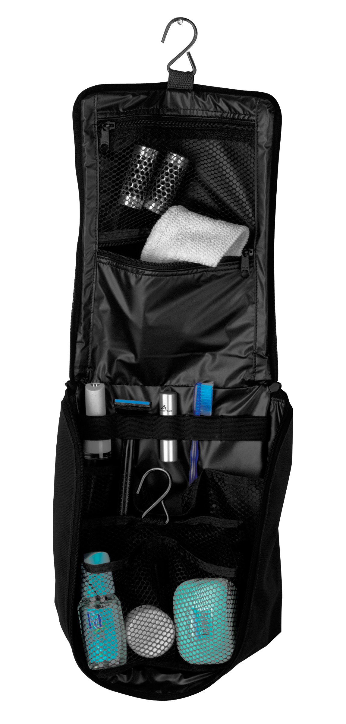 20 x 23 x 9 cm Con prácticos bolsillos internos. Bolsillos adicionales desmontables. Ganchos metálicos para colgar. POLYESTER 600D.