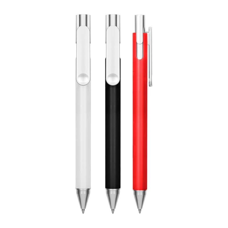 Plástico. Bolígrafo con pulsador. Cuerpo plástico de color. Pulsador, clip y puntera plásticos color plata. Detalle en el clip