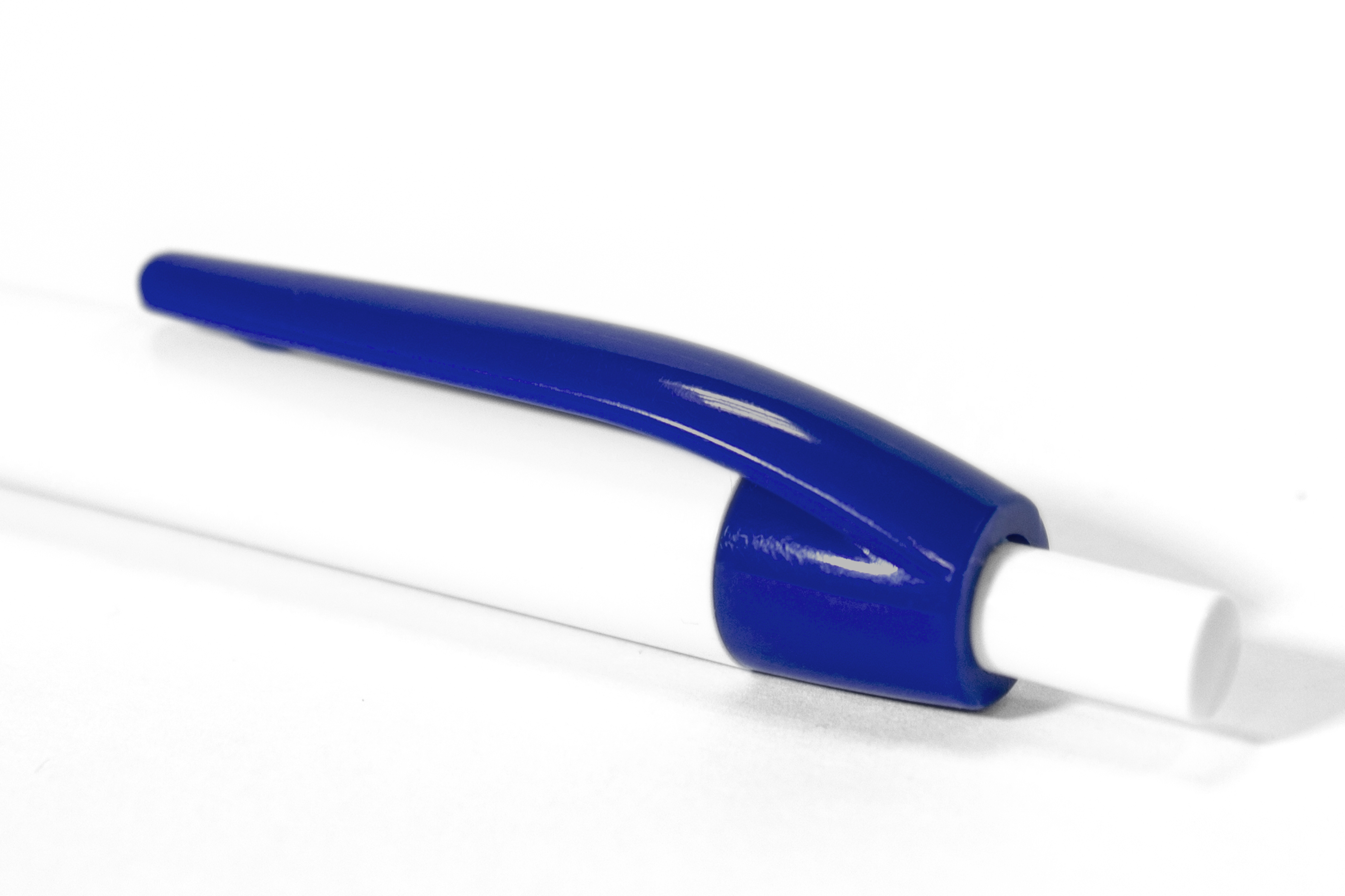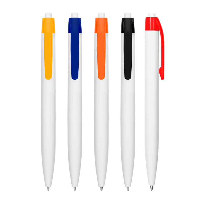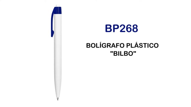 Plástico. Lápiz pasta con pulsador. Cuerpo plástico de color blanco y clip de color. Pasta azul