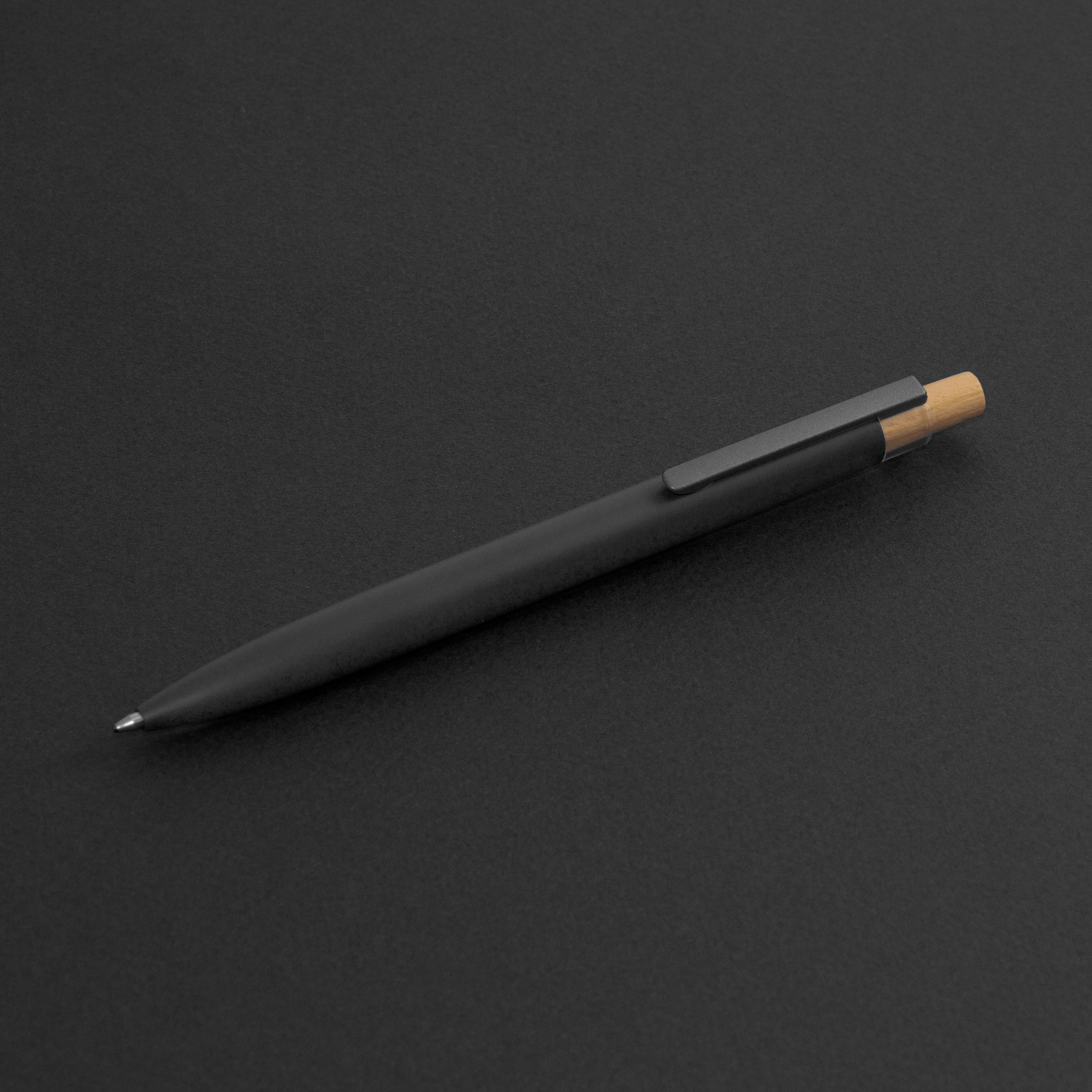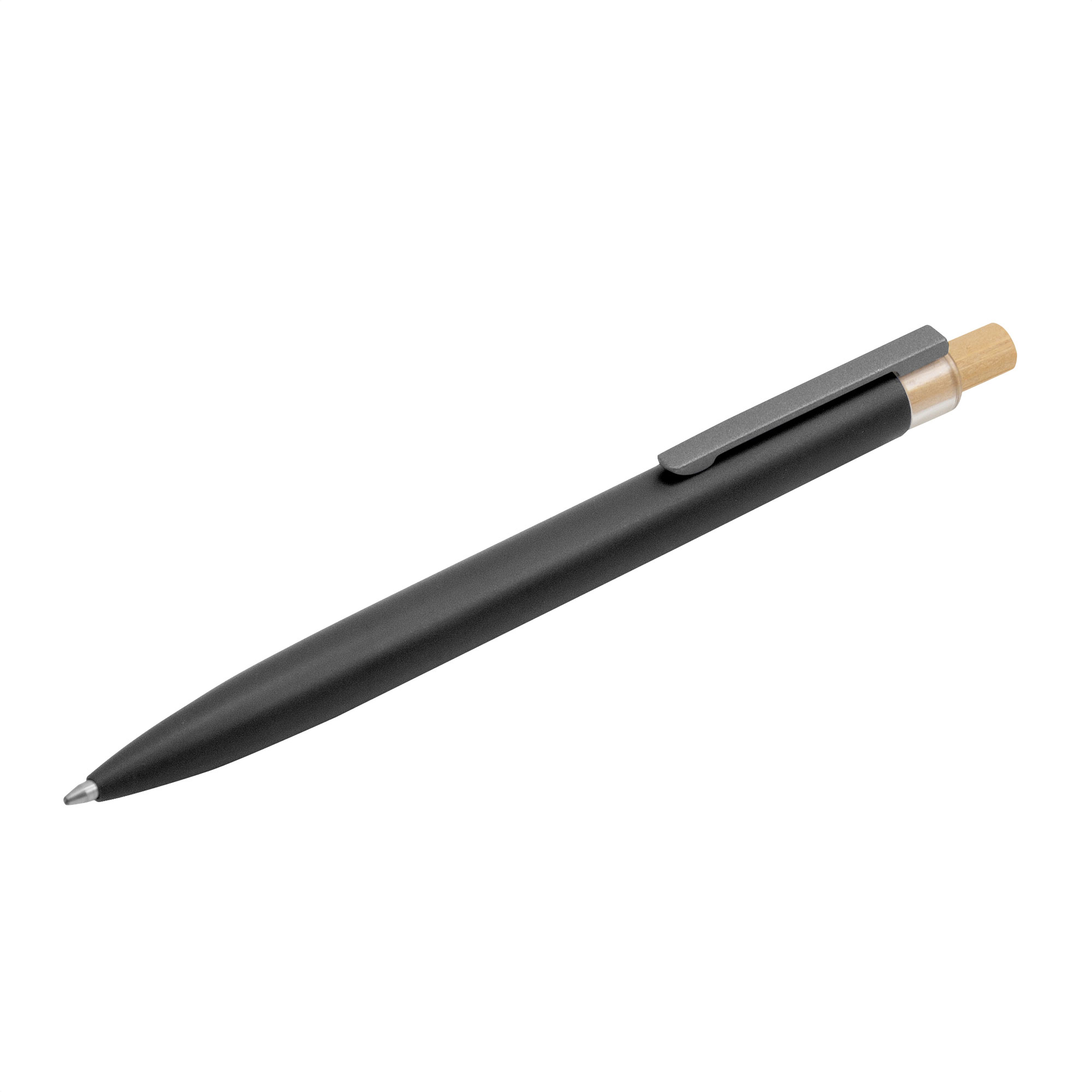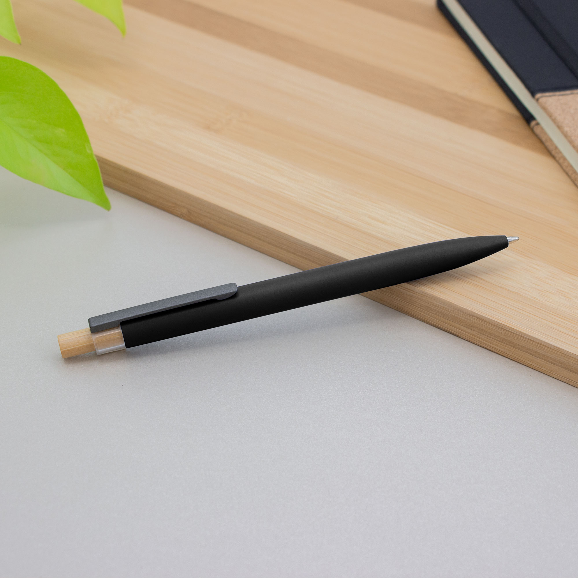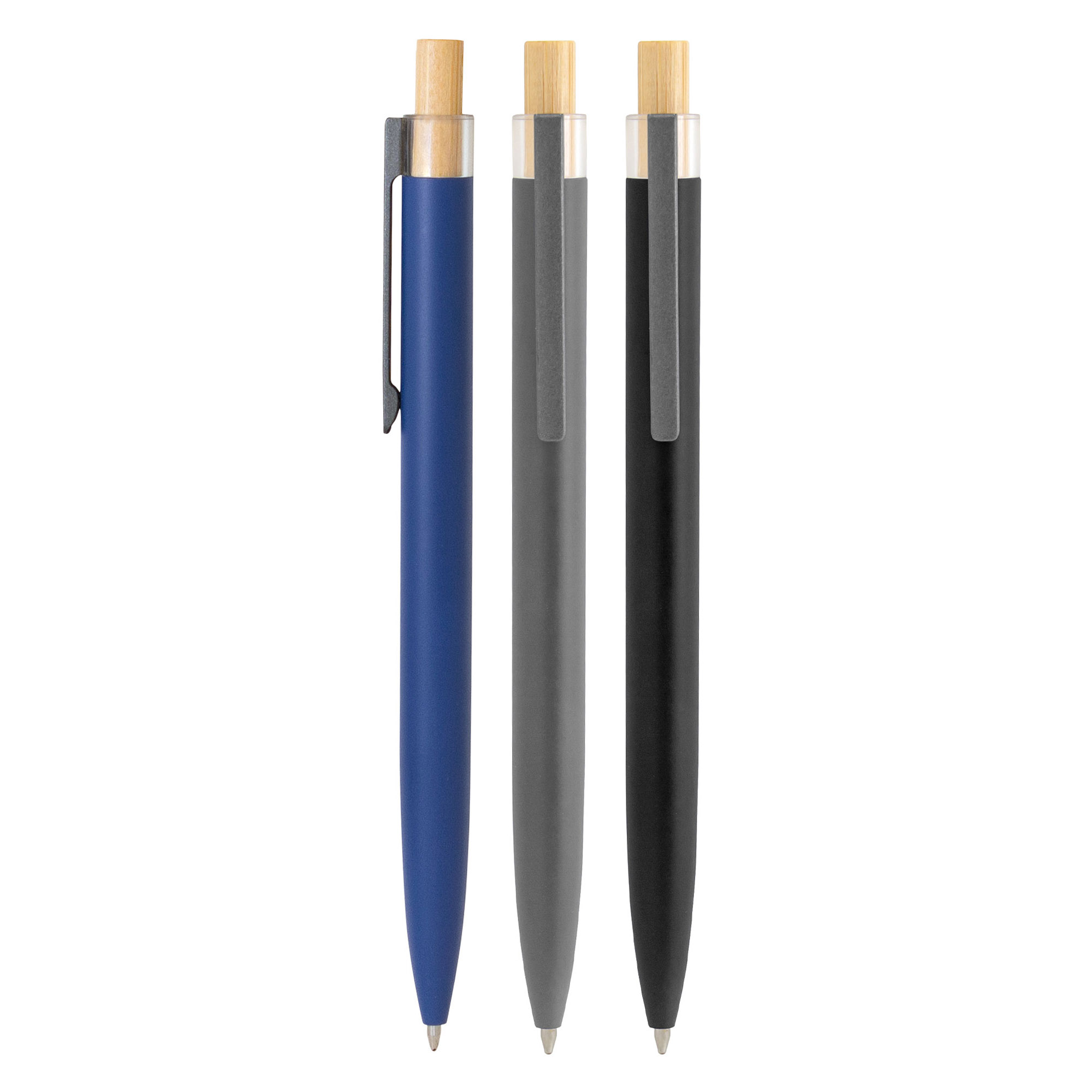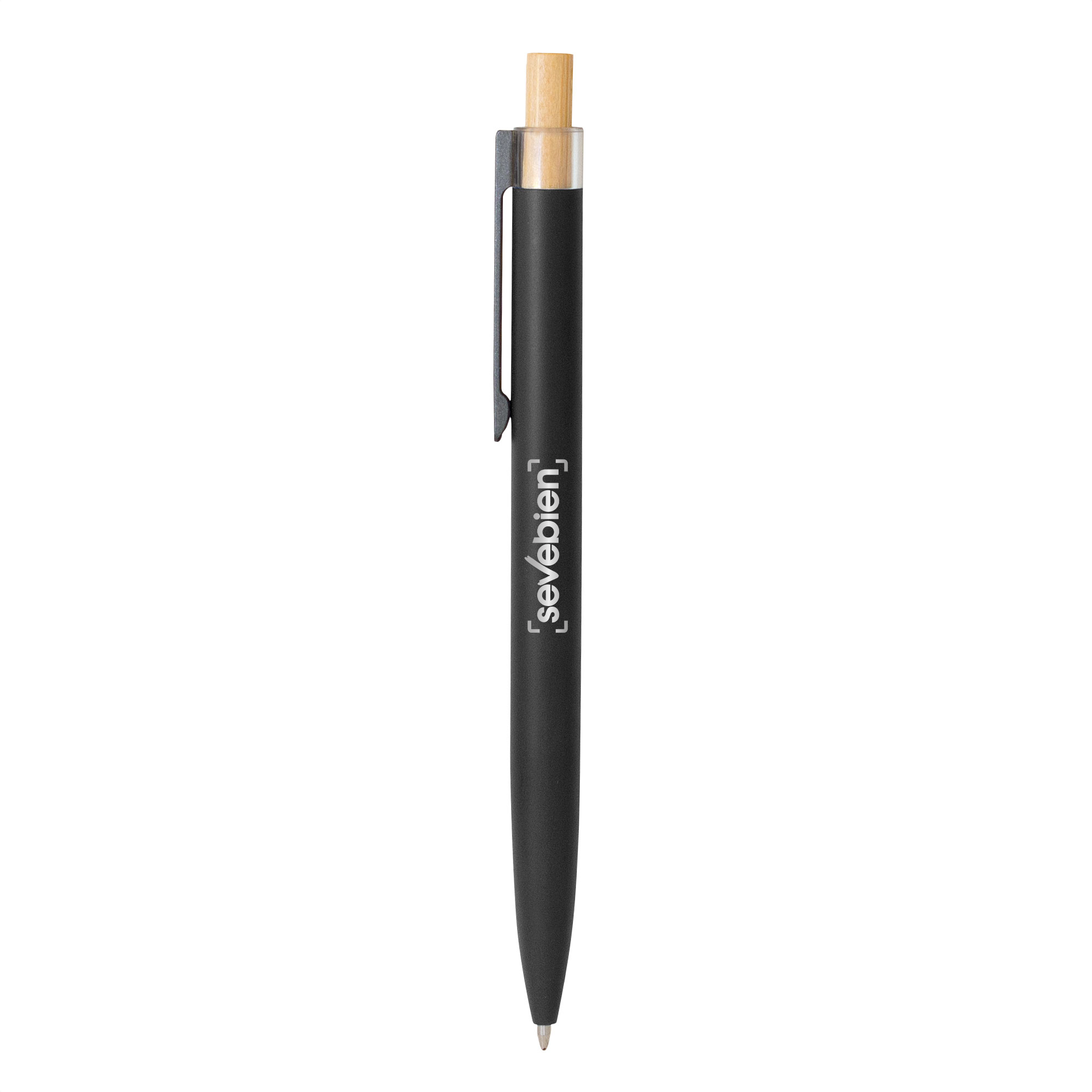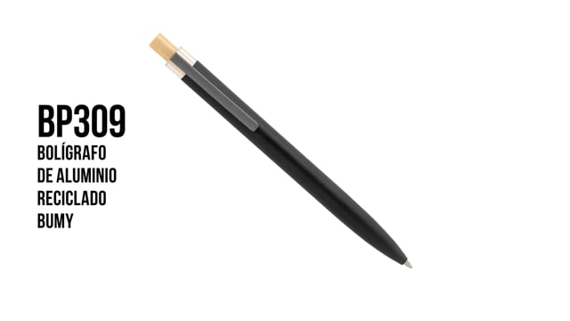Aluminio reciclado y bambú. Bolígrafo retráctil. Cuerpo metálico en diferentes colores acabado mate. Clip metálico color gris acabado mate. Pulsador de bambú. Tinta negra.