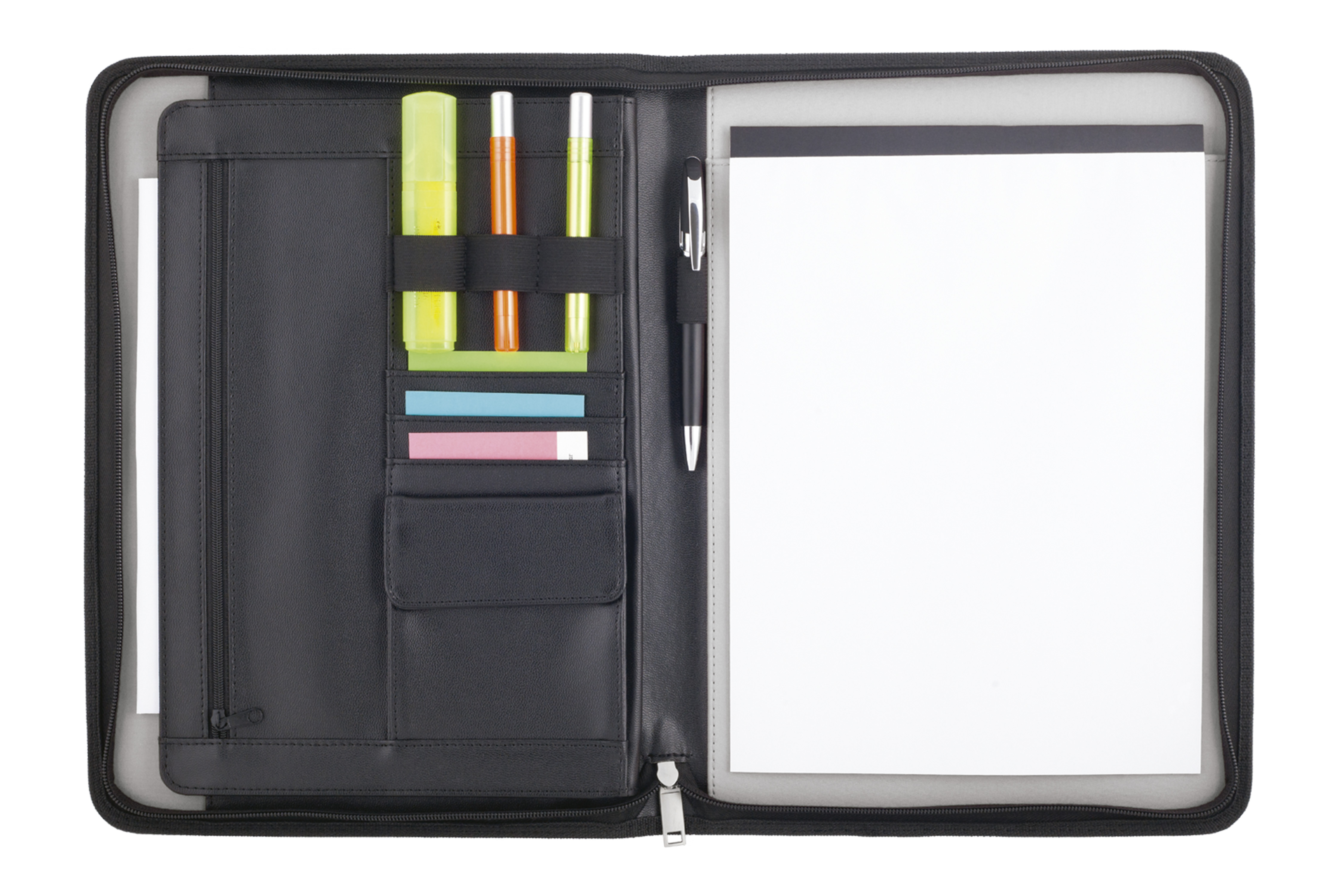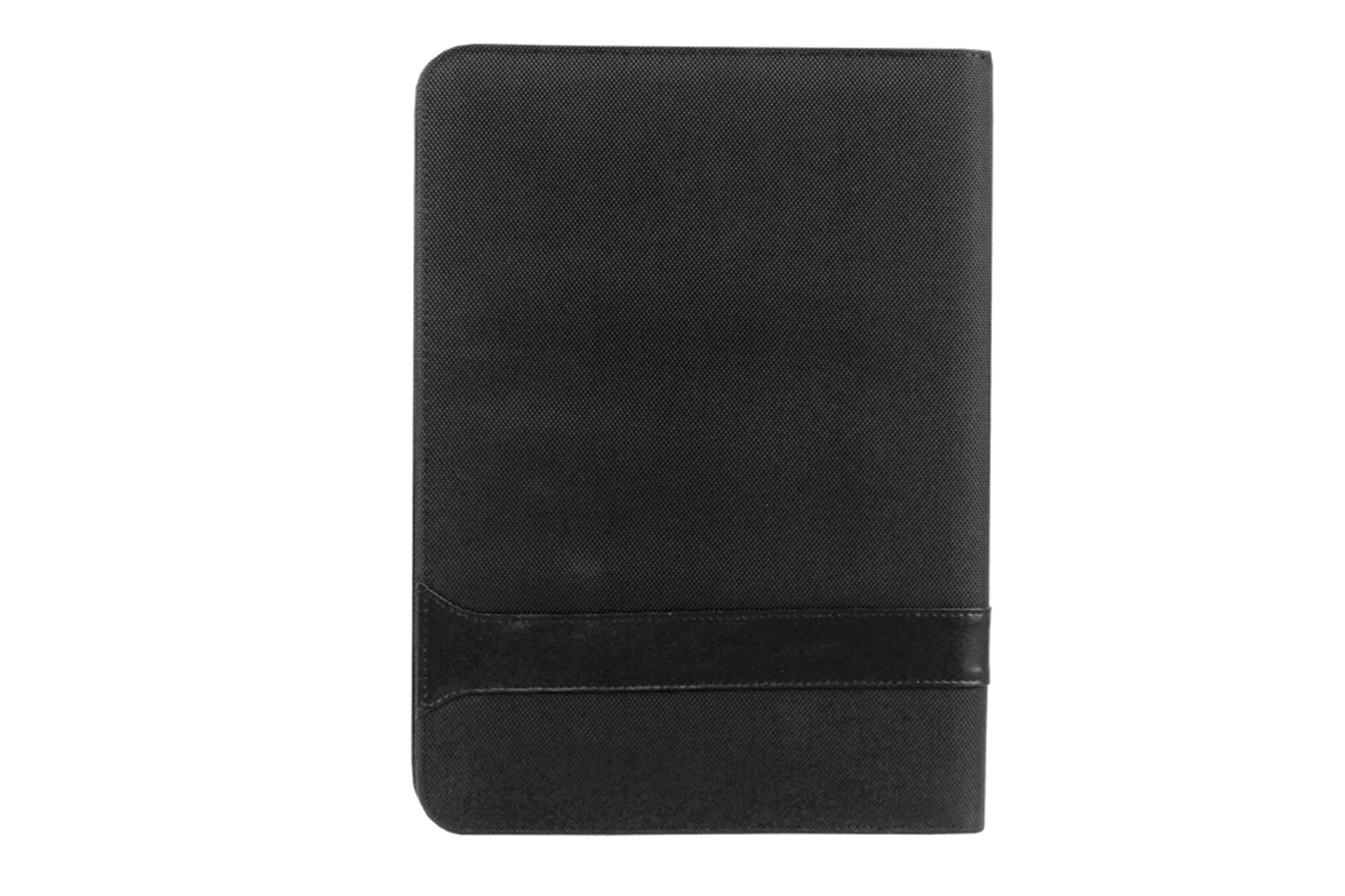 34 x 25 cm. Exterior de Nylon, Microfibra y detalles en símil cuero y metal. Interior: compartimento, bolsillo con cierre, tarjetero, porta bolígrafos elástico y hojas A4 lisas.