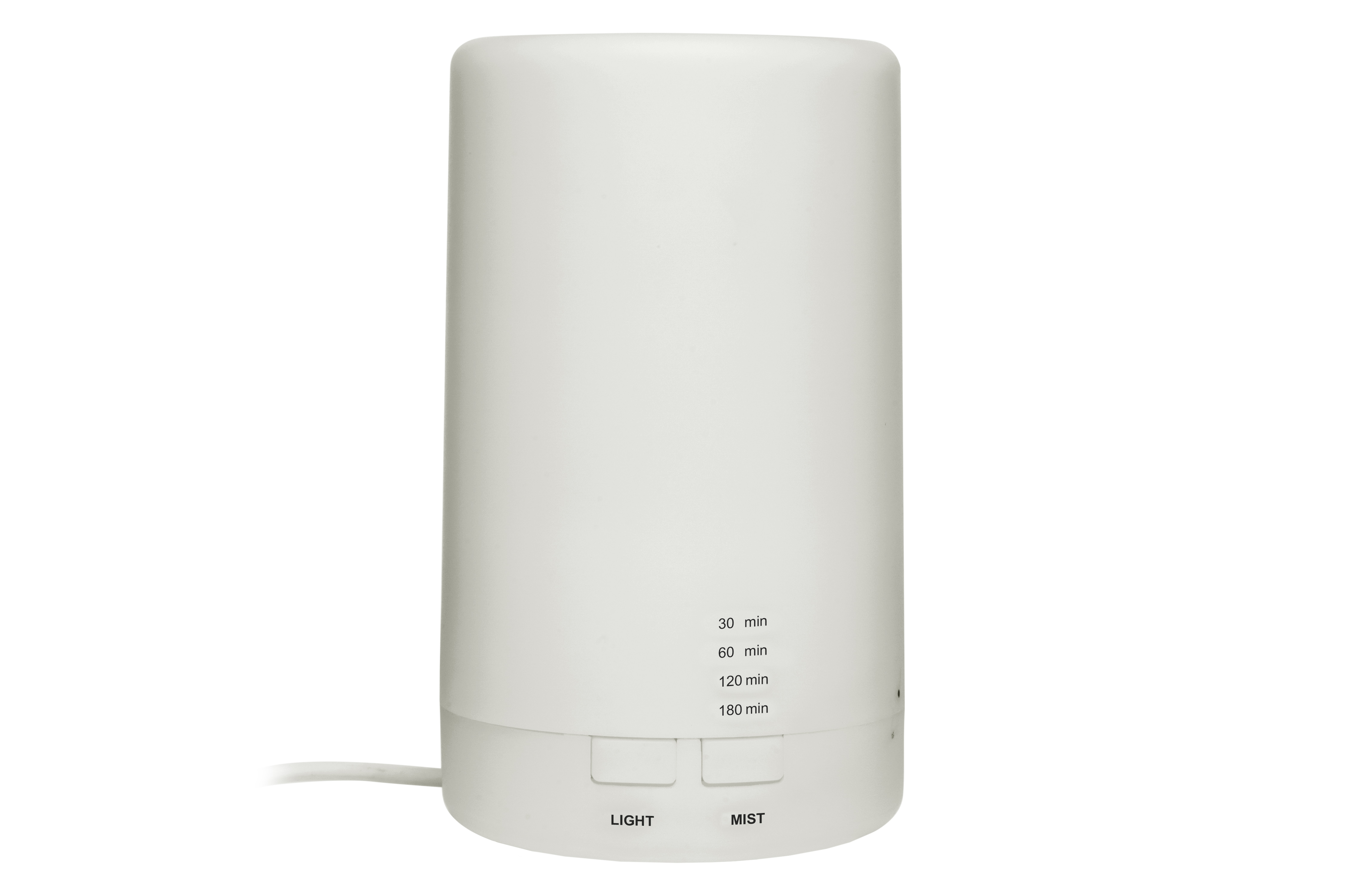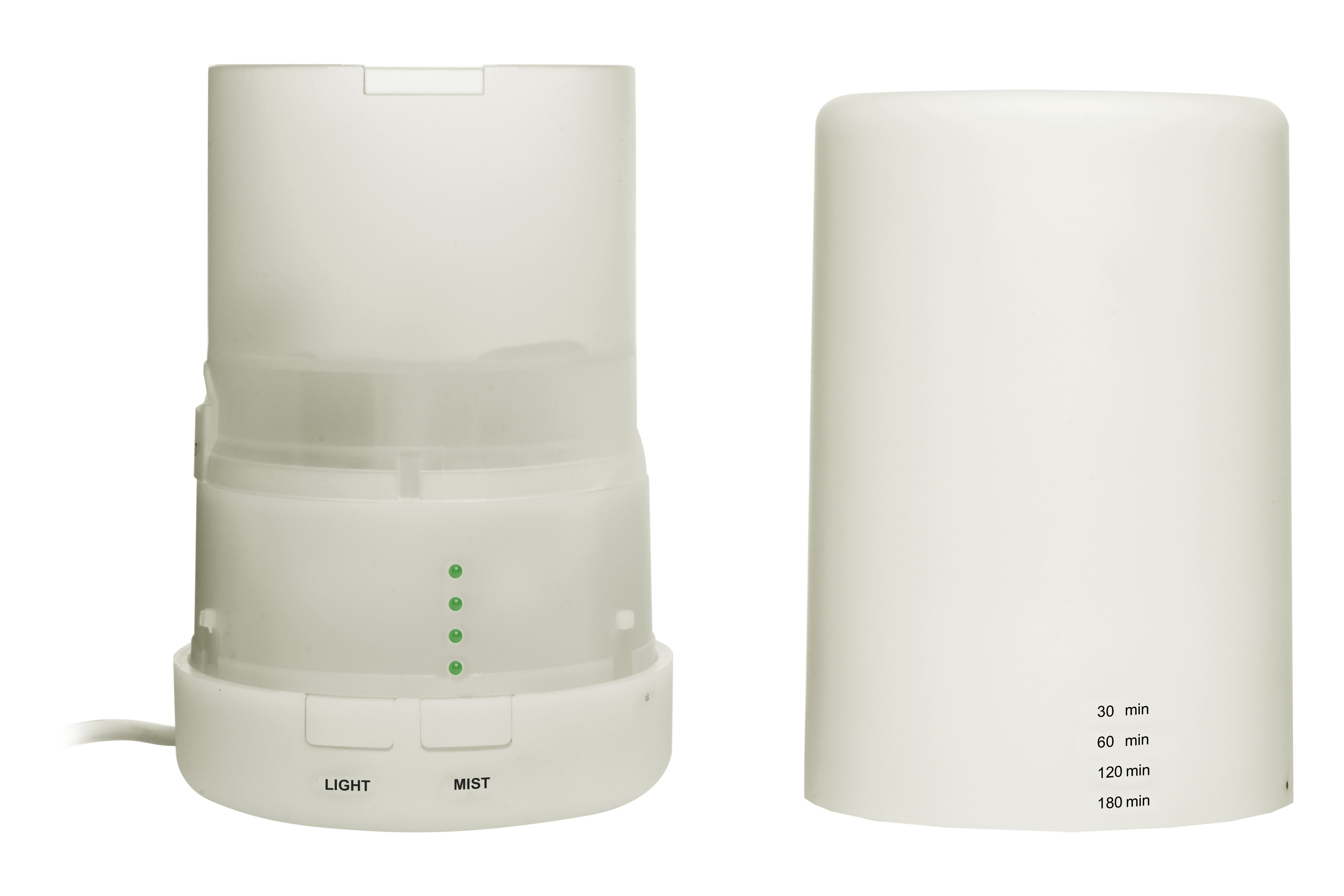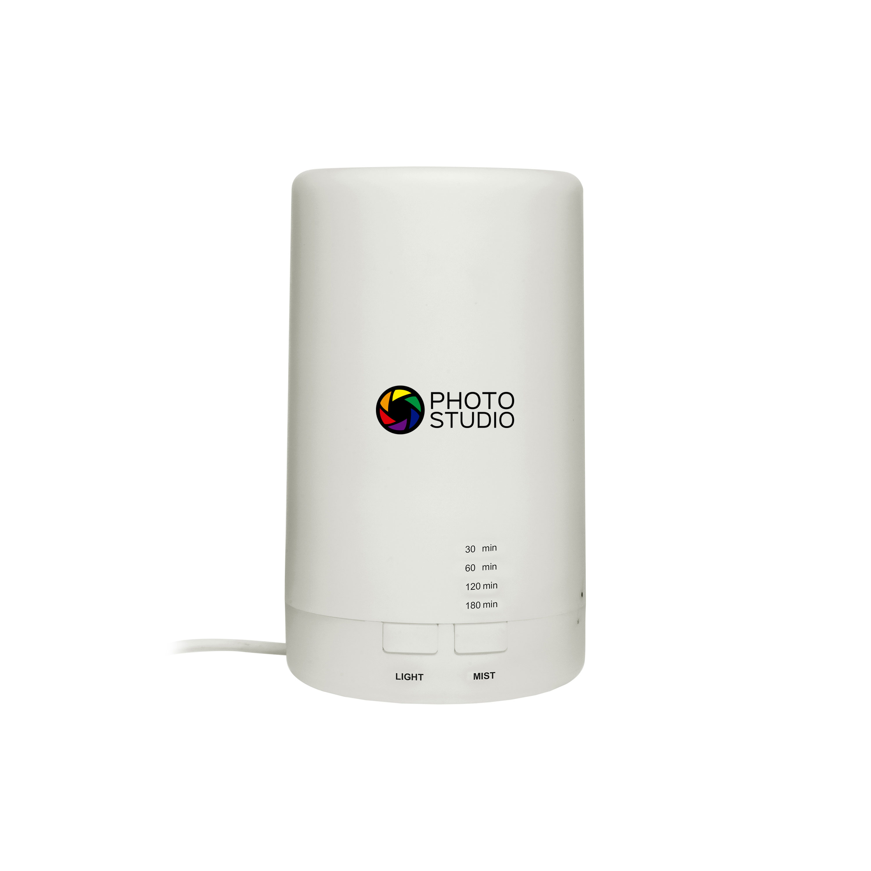 Ø 7 x 12,5 cm. Capacidad 125 ml. Plástico. Humidificador de ambiente con luz led. Apto para usar como difusor de aroma. Indicador de mínimo y máximo de agua en el interior. Botón con dos niveles de intensidad de luz. Botón para elegir la duración de encendido entre 30, 60, 120 y 180 minutos. Apagado automático al finalizar la duración elegida. No abrir ni mover mientras esté encendido. Cable de alimentación de 1mt con salida USB. Voltaje DC 5V