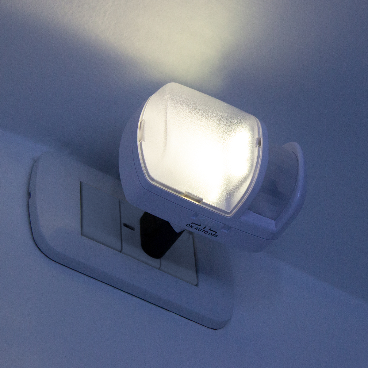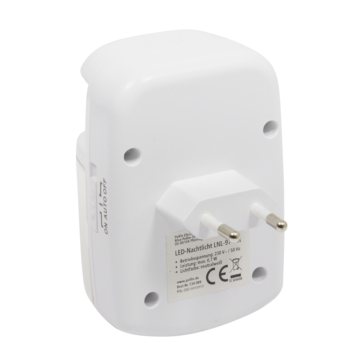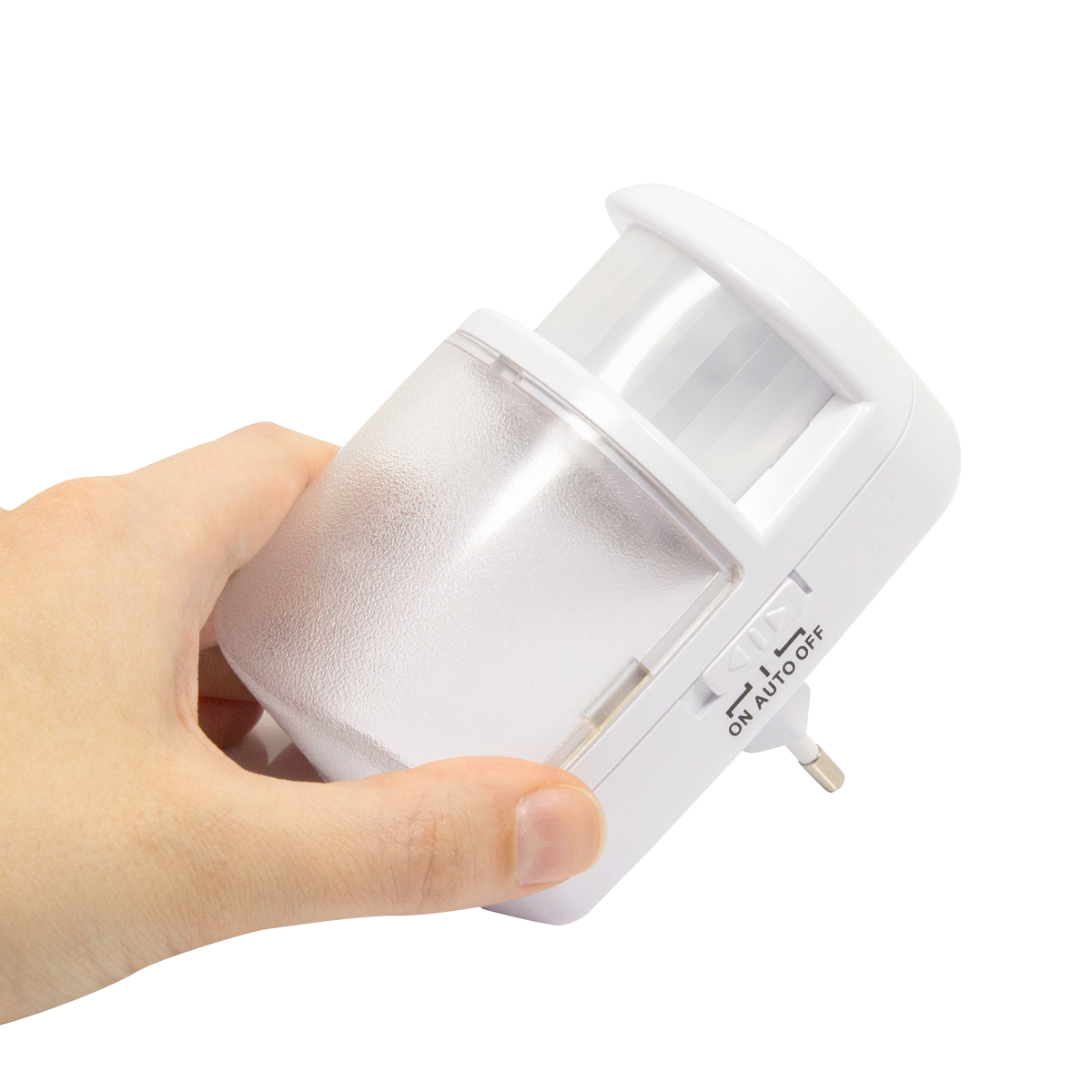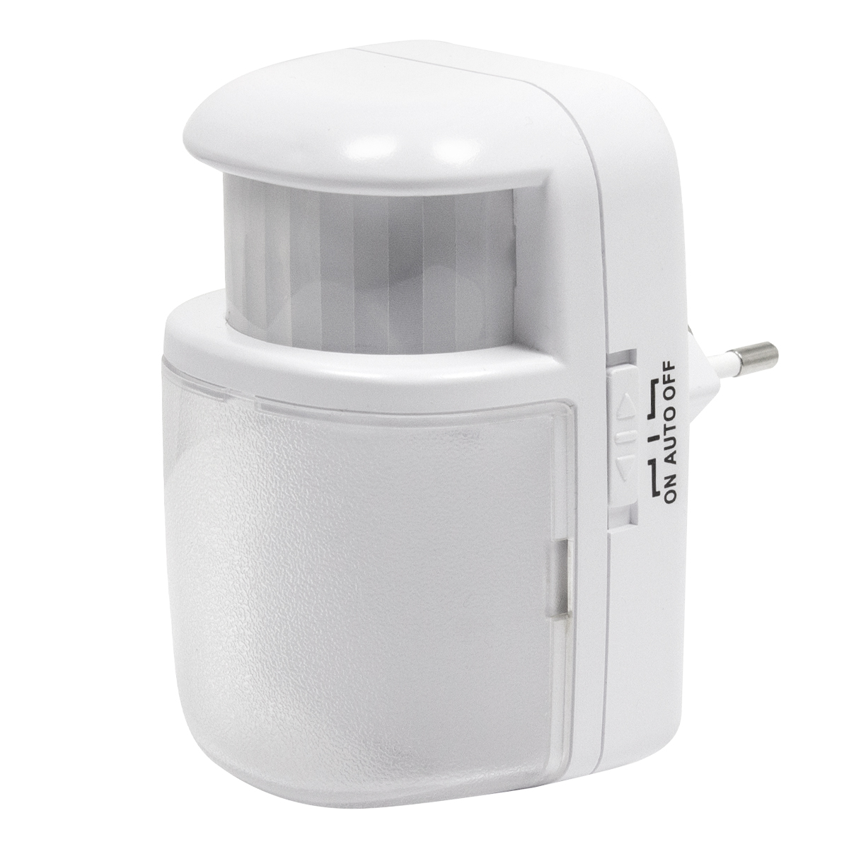 Luz Led de noche. Ideal como iluminación de seguridad para habitaciones infantiles, pasillos, escaleras, habitaciones de hospitales, etc. Lámpara Frontal: Se ilumina con la ayuda de tres LED integrados en blanco neutro ligero. Tiene interruptor: Encendido/Apagado/Automático ante movimiento. Detector de Movimiento: Detecta el movimiento en la oscuridad para activar la luz. Enchufe europeo. Cuando el aparato detecta movimiento en la oscuridad, la luz se activa durante 1 minuto y la parte frontal de la carcasa brilla en un blanco brillante y agradable. Duración del sonido después de la activación (modo "AUTO"): aprox. 1 min. Rango de detectores de movimiento: máx. 3,5 m.