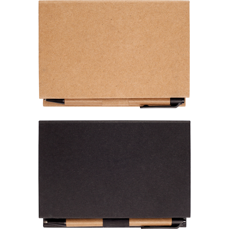 14 x 10 x 2,5 cm. Set para escritorio con block de hojas blancas, regla plástica transparente, señaladores de colores, autoadhesivos y bolígrafo de cartón con puntera, clip y pulsador de plástico negro.