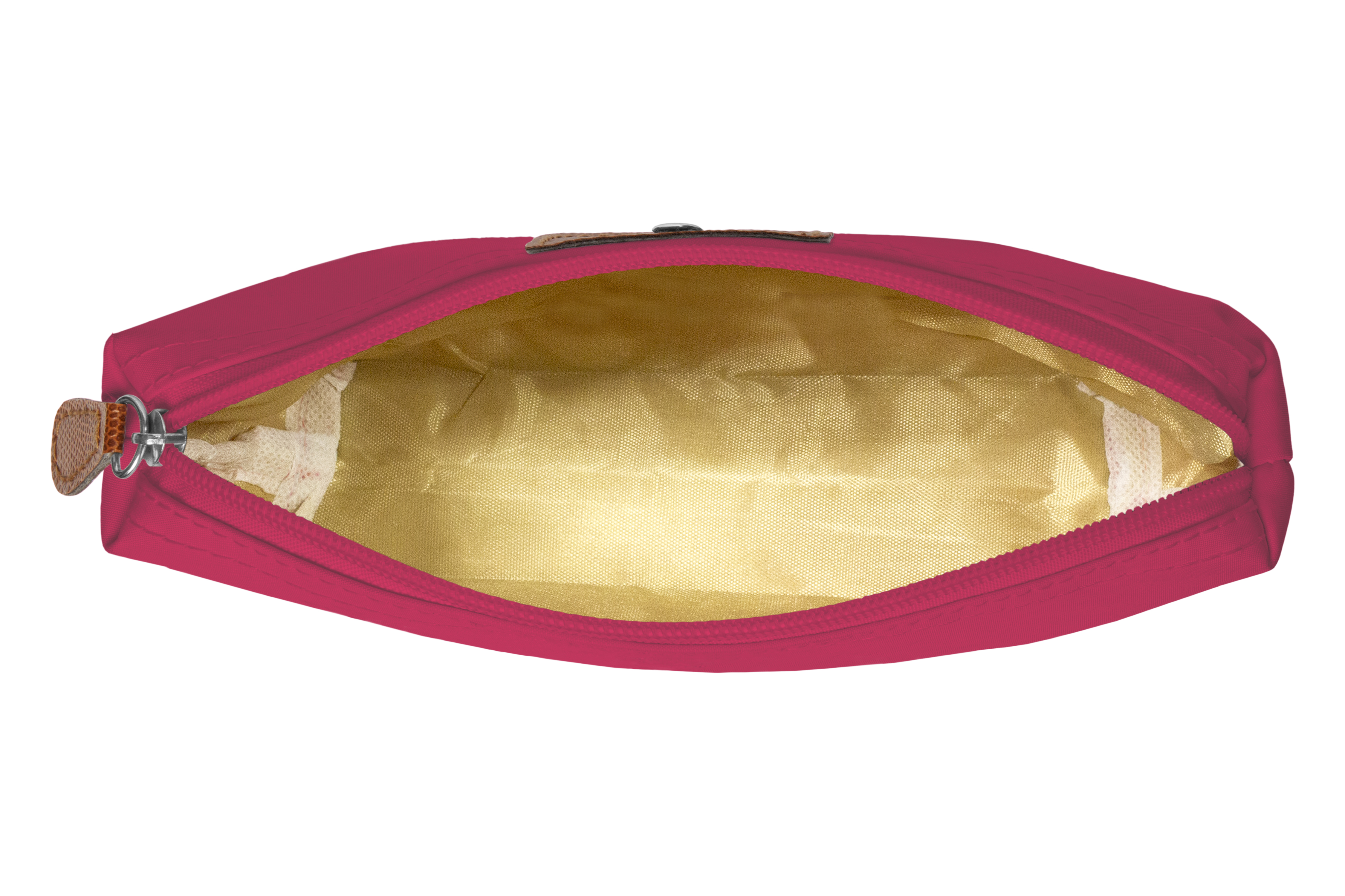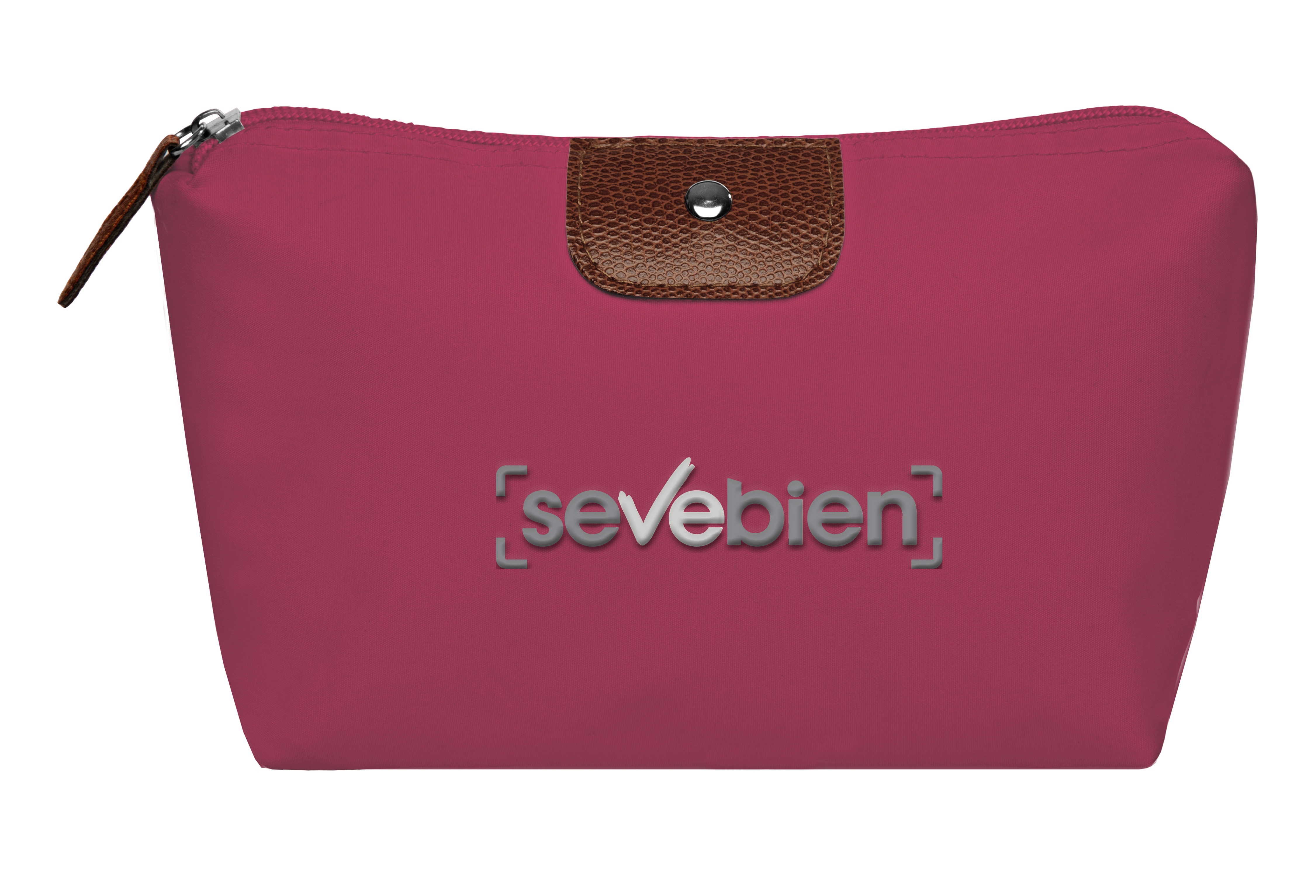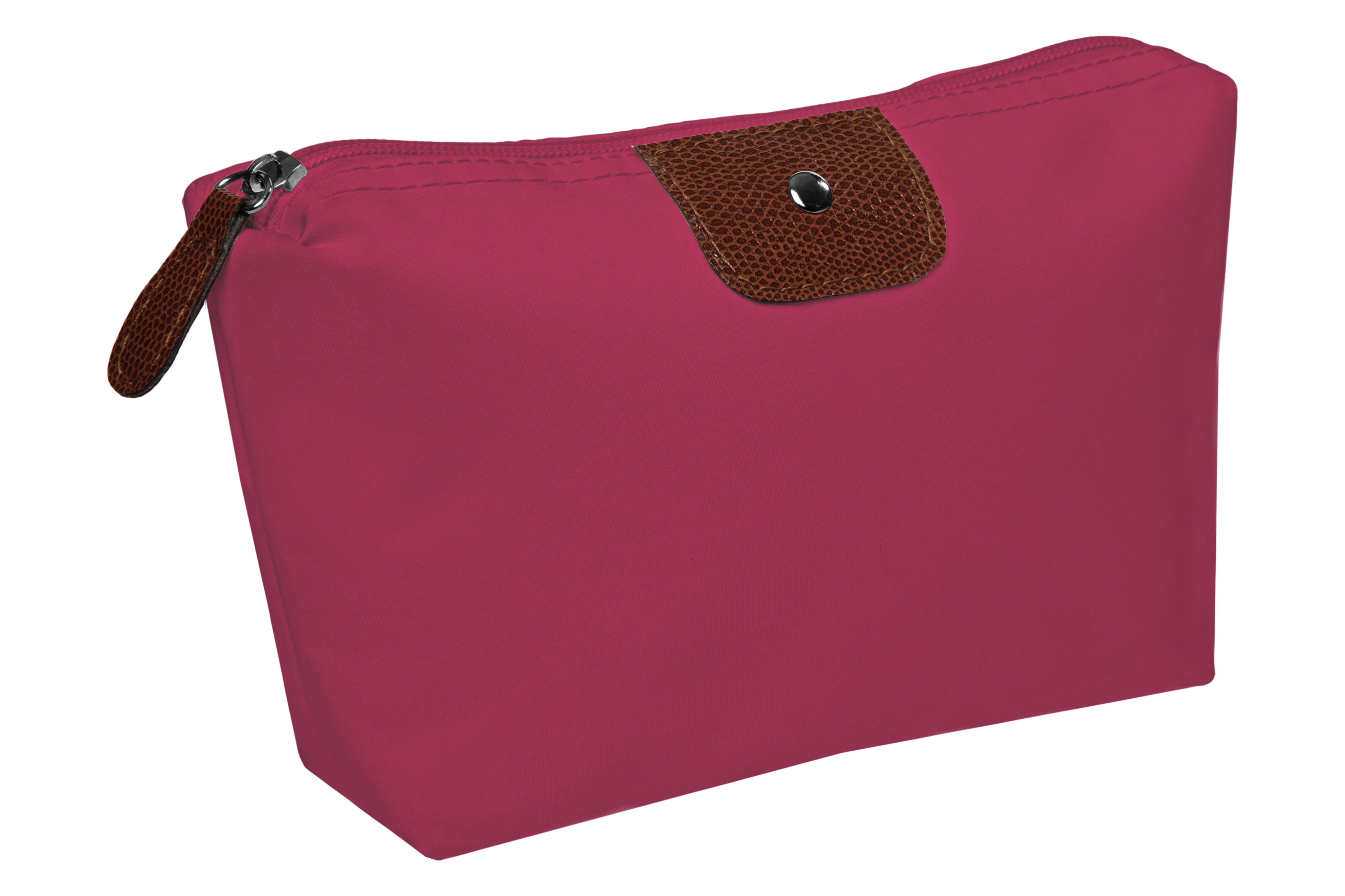 22 x 13 x 5,5 cm. Polyester. Necessaire / cosmetiquera con detalles en símil cuero y un botón metálico en el frente. Interior con forro. sujetadores de cierre de símil cuero.