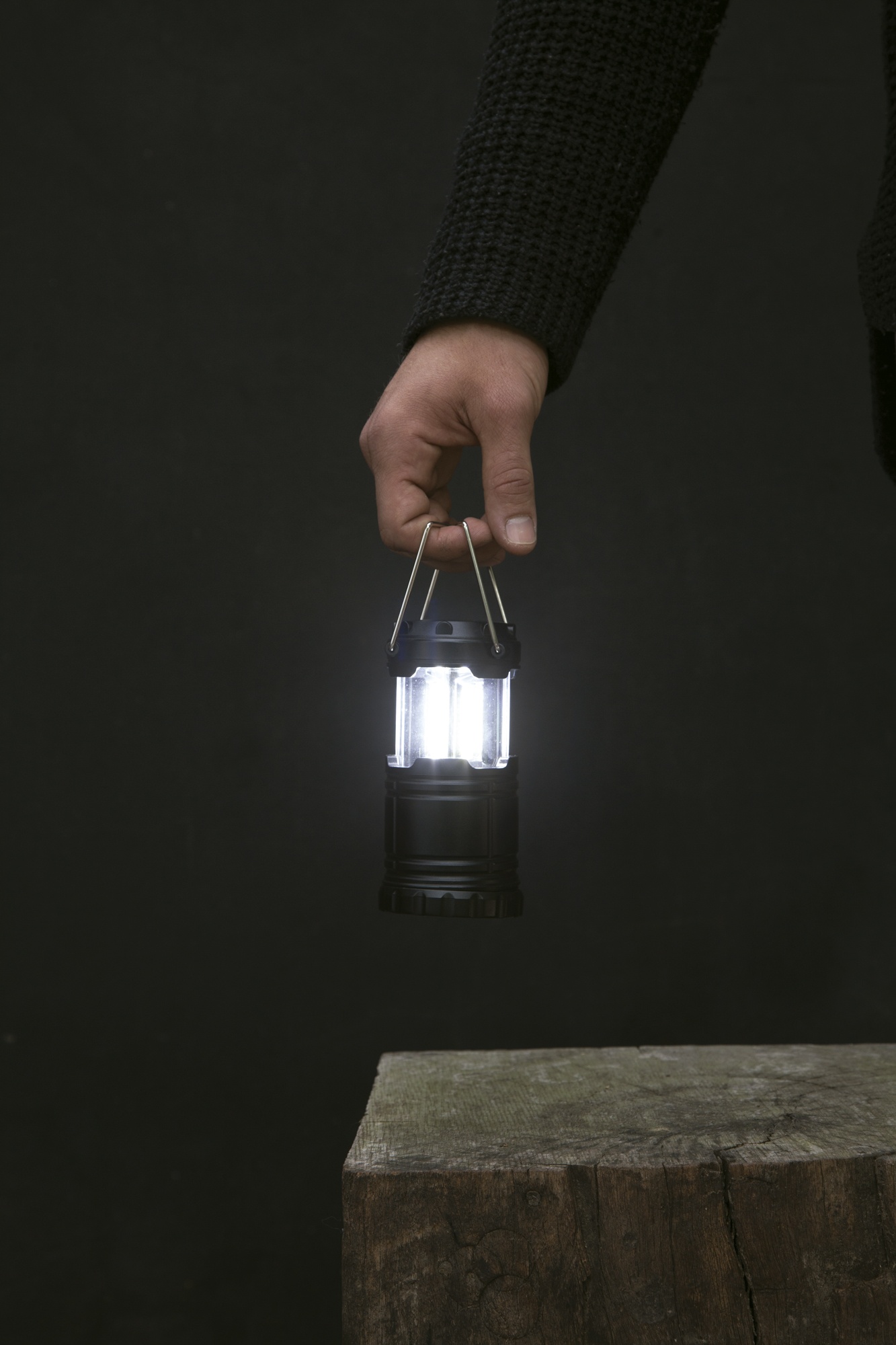 Ø 6 x 9,5 cm (cerrado) Ø 6 x 13,5 cm (abierto). Plástico. Farol de luz led con dos agarraderas metálicas. Al desplegarse hacia arriba se enciende la luz. Funciona con 3 baterías AAA.(no incluidas) Presentación en caja de regalo.
