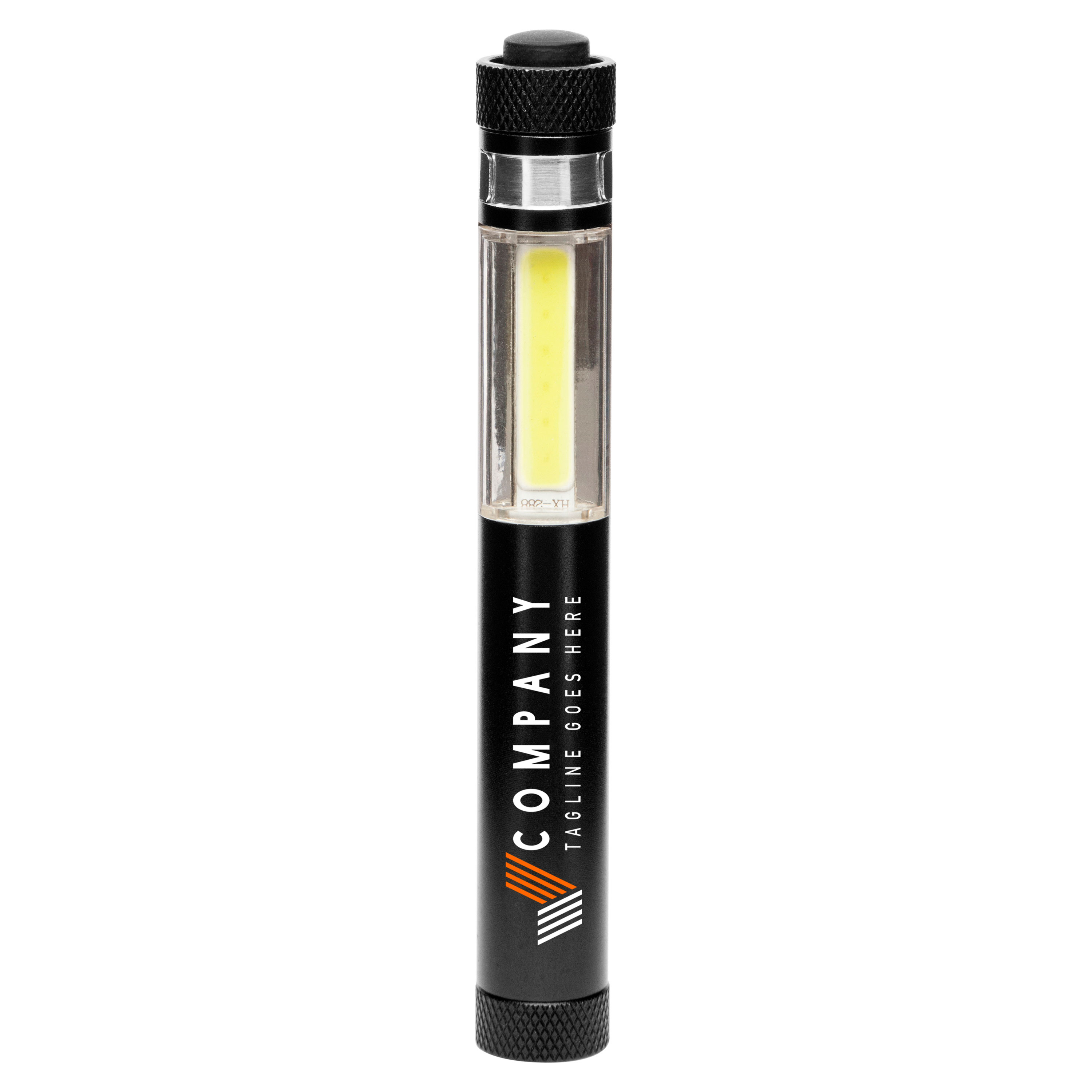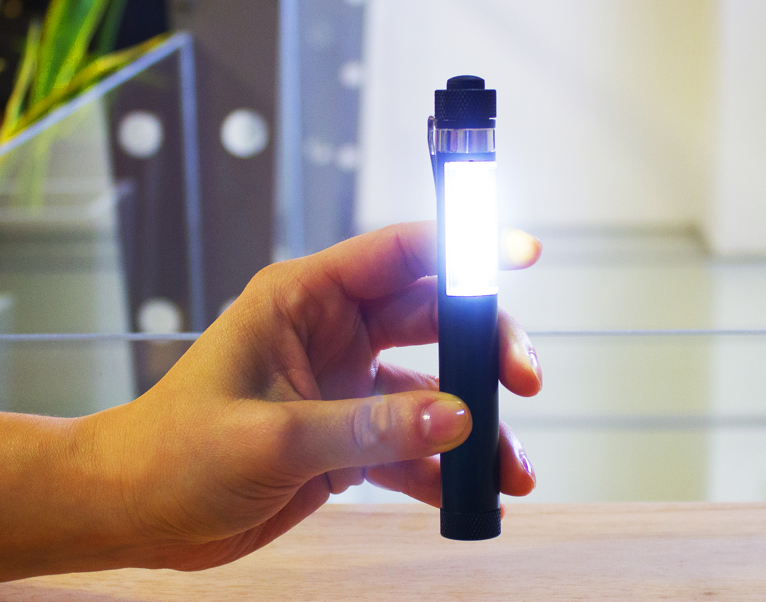 Ø 1,5 x 12 cm. Metal. Linterna con botón de goma y clip metálico. Luz led. Base imantada. Funciona con una pila AAA.