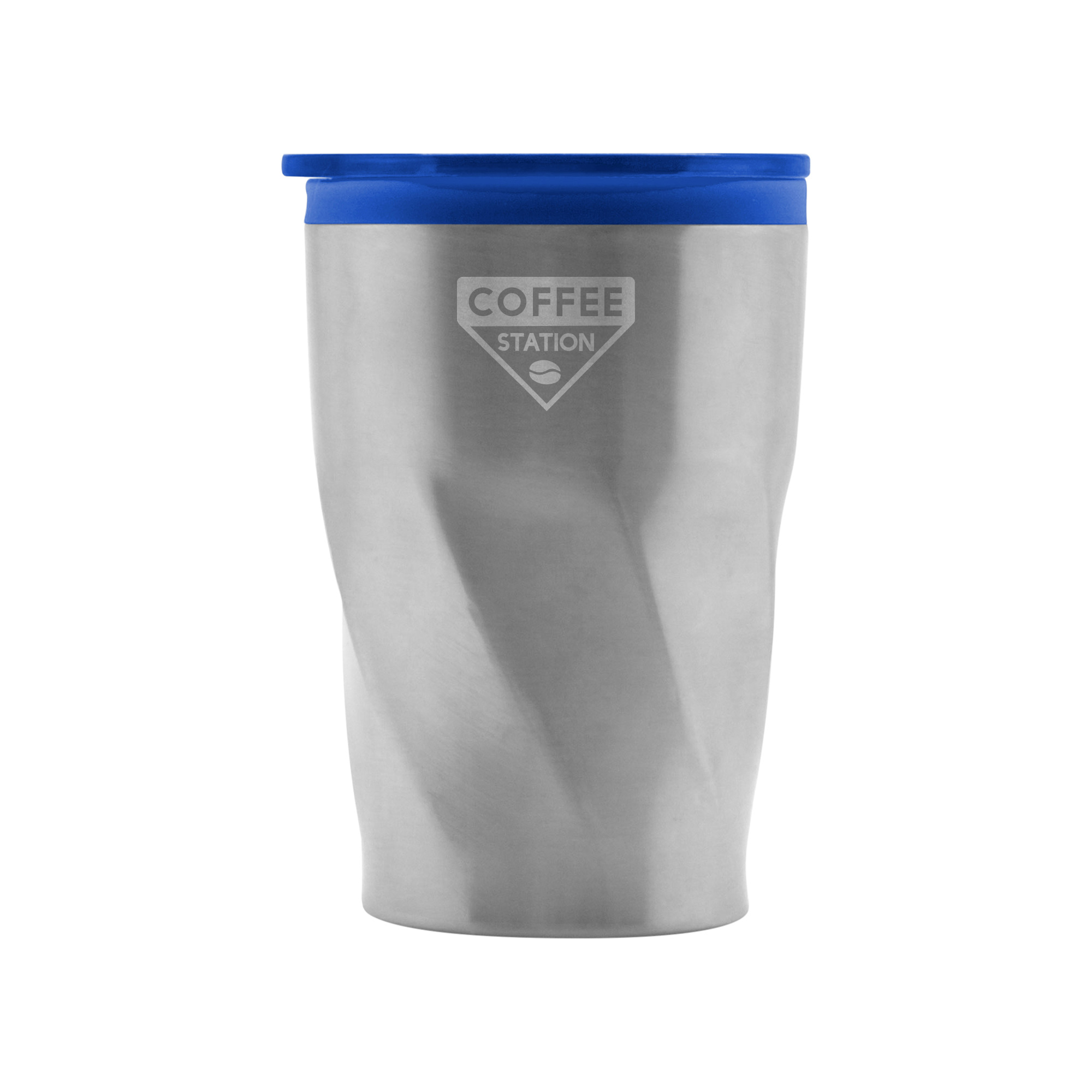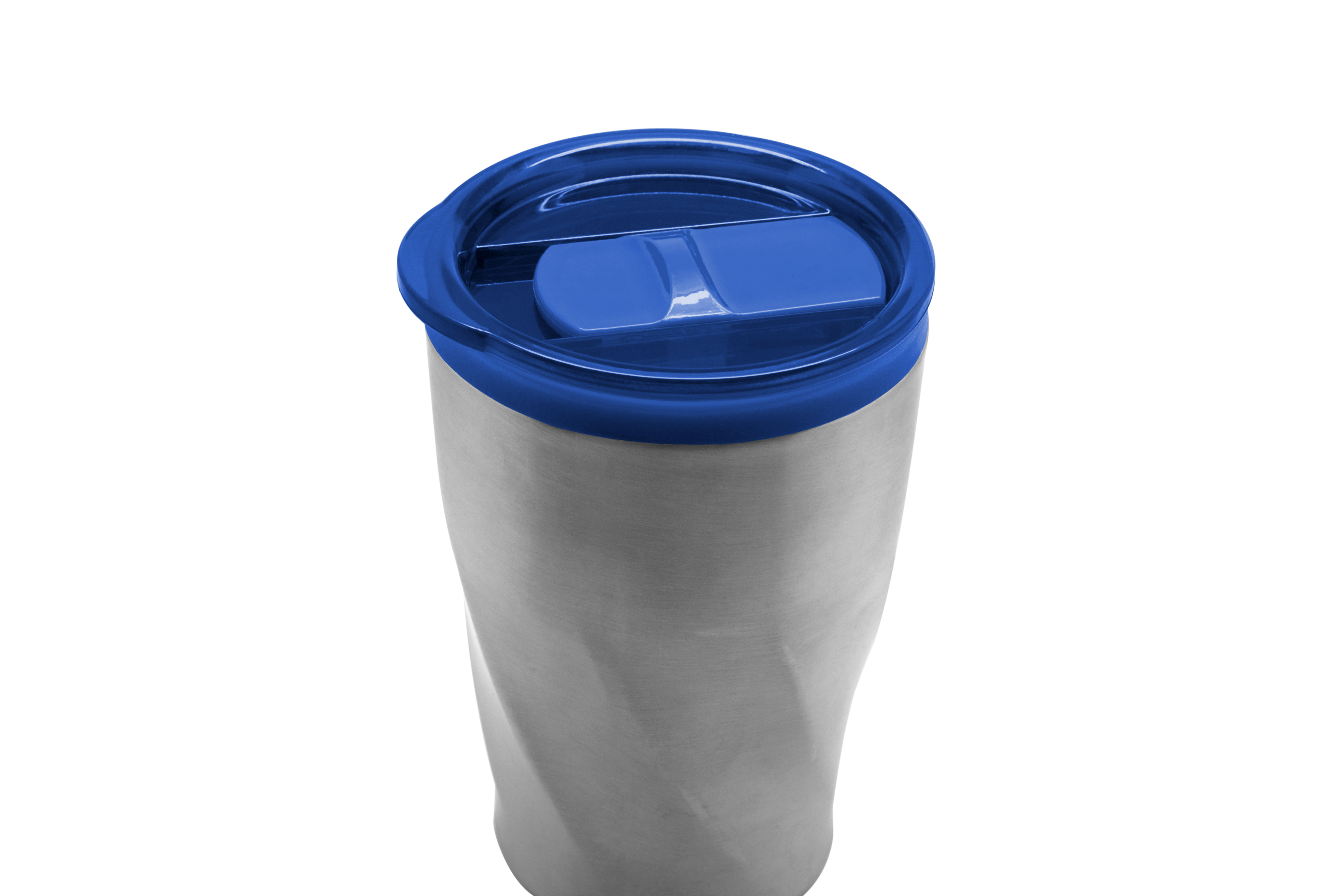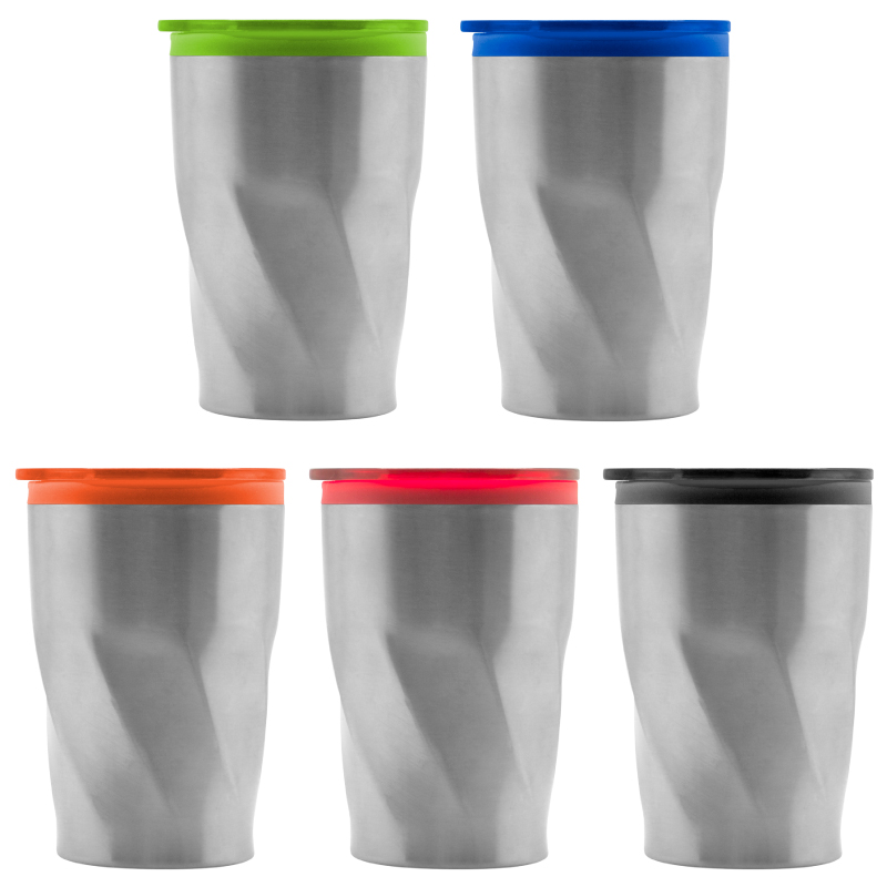 Ø  8,3 x 12,5 cm. Capacidad 380 ml. Acero inoxidable. Mug doble pared. Interior plástico y exterior metálico con detalles facetados. Tapa plástica de color con seguro antiderrame. base antideslizante. Presentación en caja de regalo.