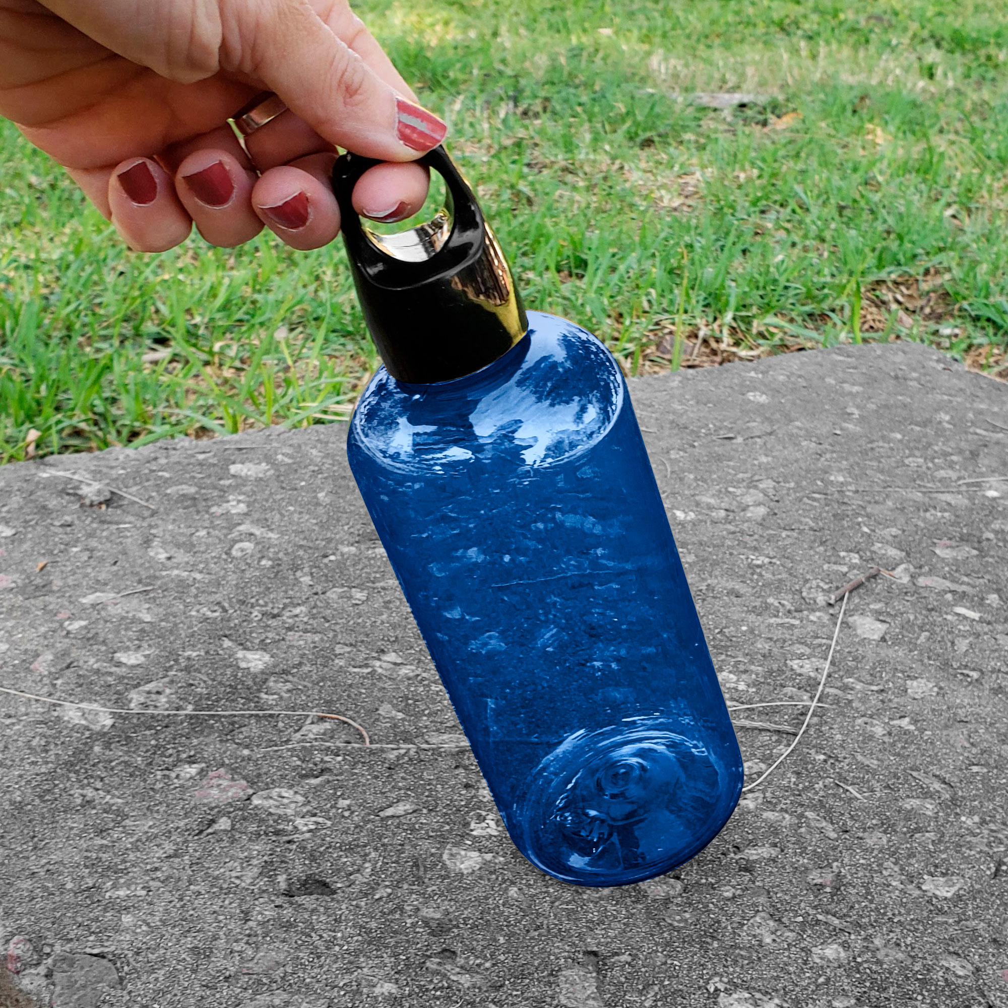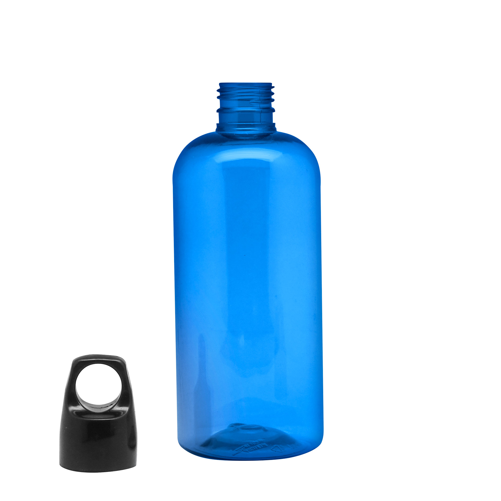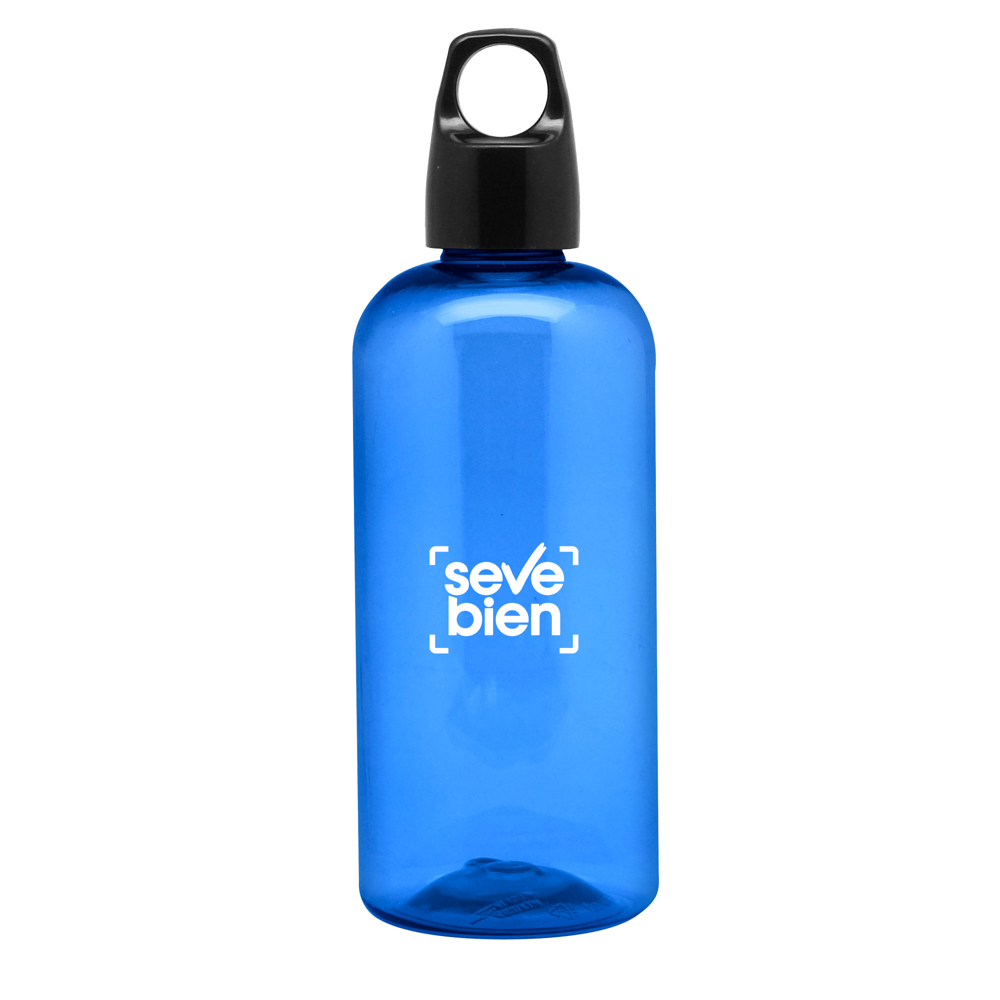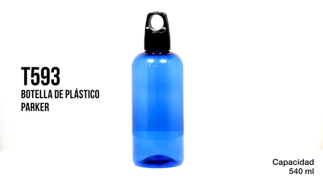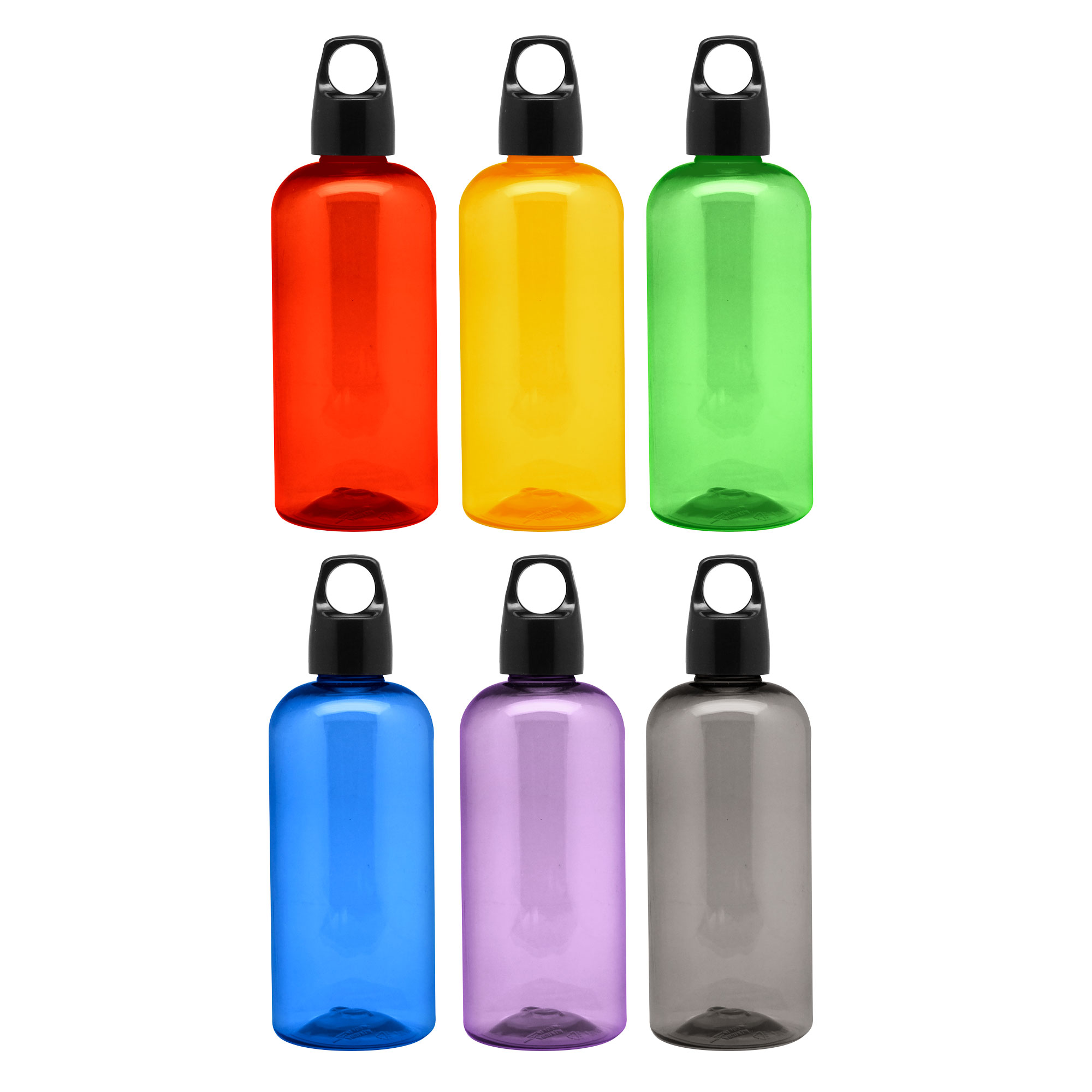 Ø 7 x 20 cm. Capacidad 540 ml. Material PET. Botella de plástico de colores traslúcidos. Tapa a rosca en color negro. Ultra liviana, pesa 50g.