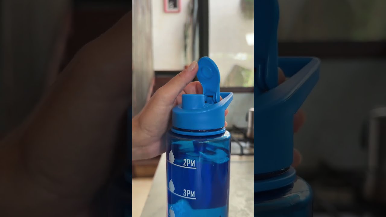 Botella con marcador de tiempo y medida. Color translúcido con tapa plástica flip top con asa, boquilla y correa del mismo color de la botella.